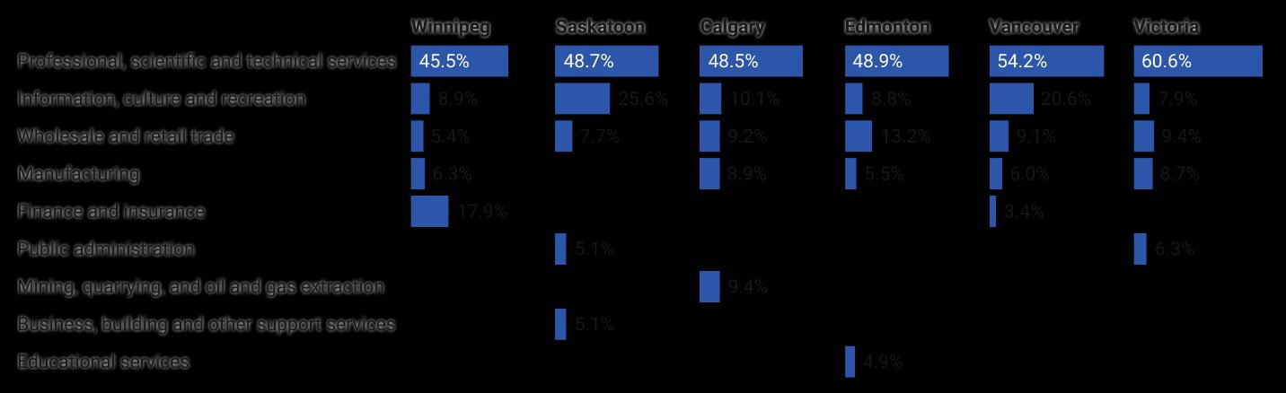 The forecasts above are built on assumptions and projections grounded in a detailed picture of the economy from the 2018 Supply and Use tables, and city level labour market snapshots from the 2016 Census detailing demographics, educational background, and other details at the occupational level. While ICTC made some adjustments to these snapshots to account for changes that have occurred since that data was gathered, especially those brought about by the COVID 19 pandemic, these are based on other primary research and ICTC insights and cannot currently be compared with a more up to date, granular picture of the economy until labour force analysis from Census 2021 is released later this year.