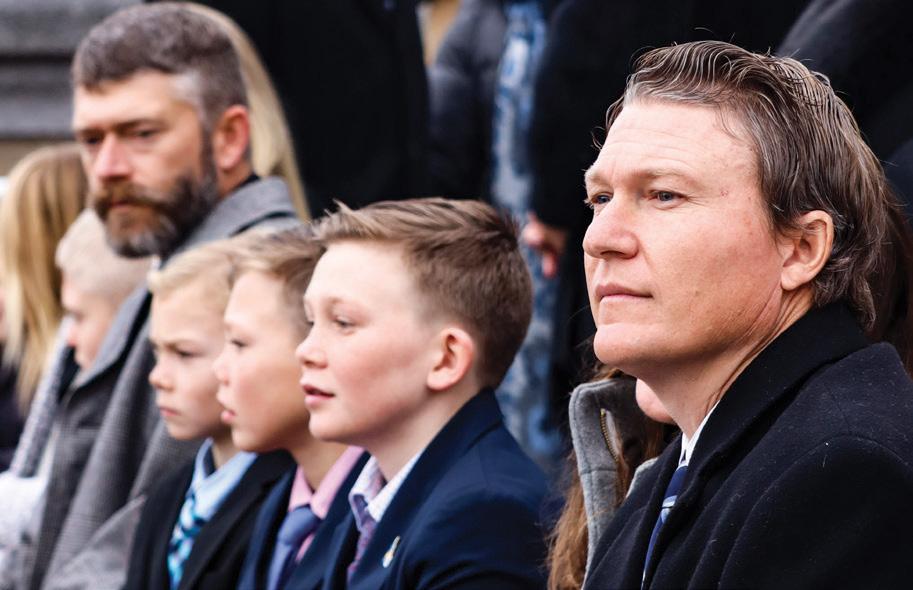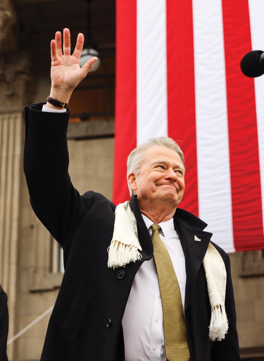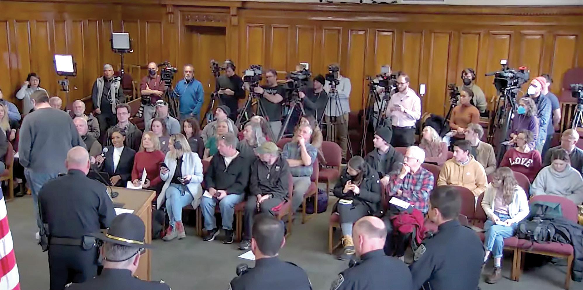 Left: University of Idaho president C. Scott Green addressed the media after the Moscow Police Department announced that a suspect had been arrested in connection with the Nov 13 homicides. Right: A crowd gathers for a press conference with the Moscow Police Department on December 30, 2022. The University of Idaho is located in Moscow, a quiet city in Latah County that shares a state border with Washington. PHOTO BY ANDREW LANG PHOTOS COURTESY MOSCOW POLICE DEPARTMENT