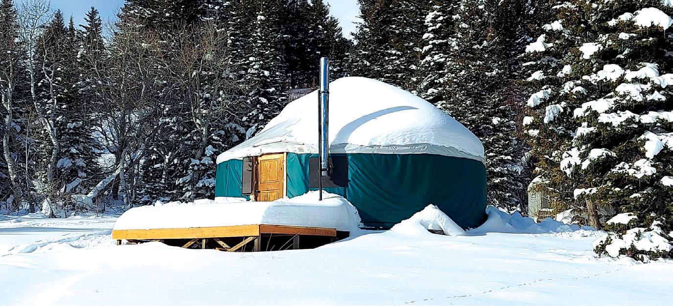 two days of cat skiing. The wood-fired yurt sleeps 12 and has a four-burner gas stove, cooking supplies, and an outhouse. While the sleeping quarters are simple, the experience can be as extravagant as the guests desire. “Joe the Yurt Dude” helps groups customize their overnighters with catering, down-mountain dining excursions and, timed correctly, he’ll even help you chase down some full moon powder shots.