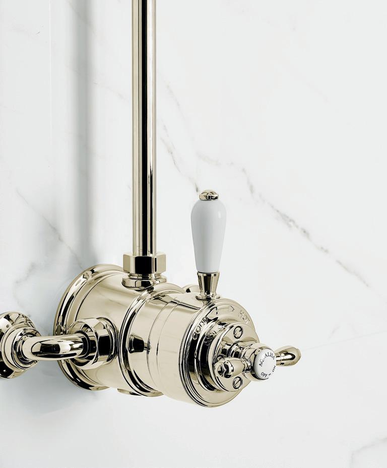 This luxury heritage-style mixer shower exudes sophisticated elegance. Its traditional design combined with solid brass construction make it a stunning addition to any classic bathroom or shower space. Select from exposed or concealed options and either chrome or gold finishes for an individual look and feel. Features Aqualisa’s unique bi-metallic coil for thermostatic precision and reliable performance.