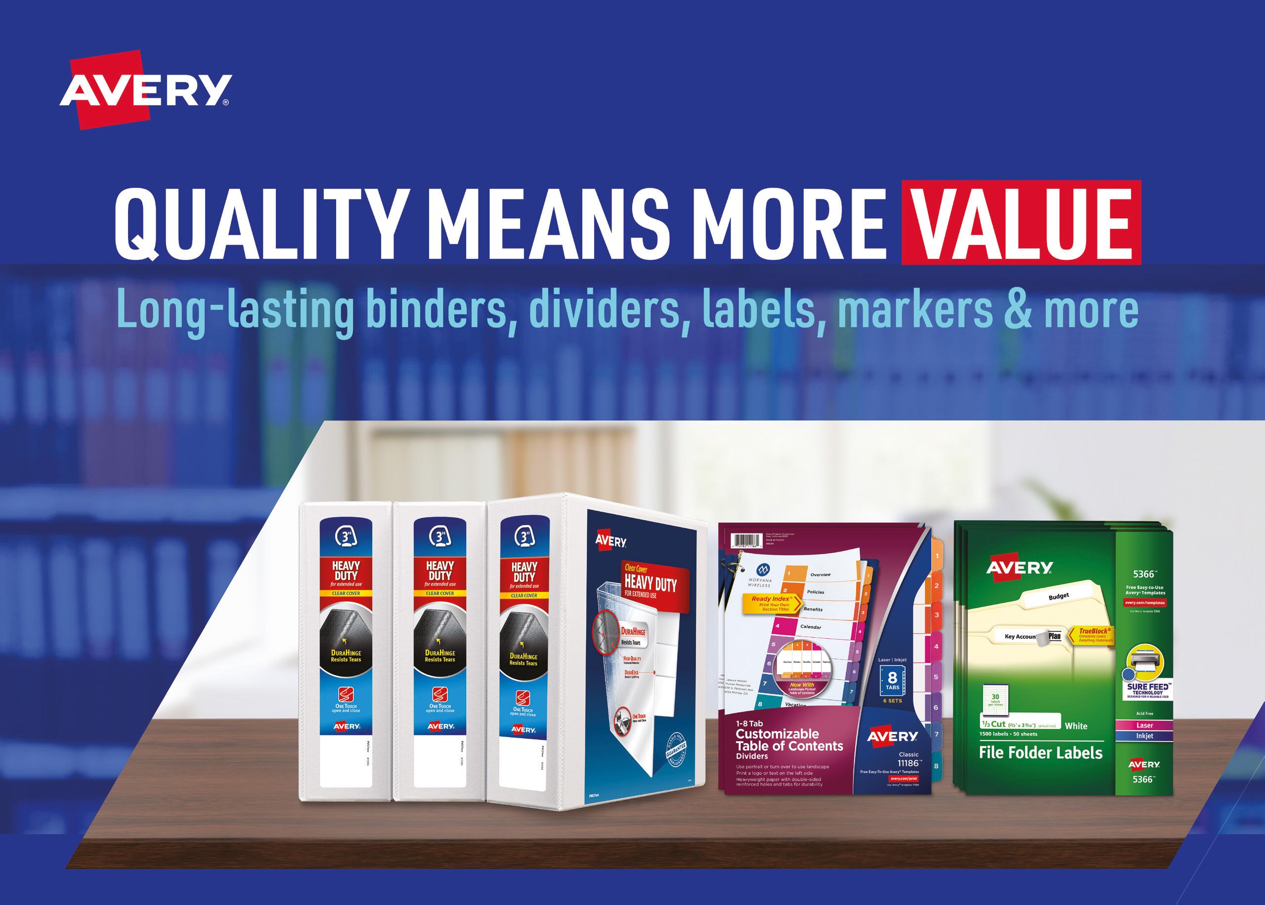 Whether you're organizing, mailing & shipping or presenting to customers, do everything better with durable Avery products. Our binders, dividers and labels offer exclusive features and unique designs to hold up to frequent, everyday use. Fill your supplies today with business tools you can rely on.