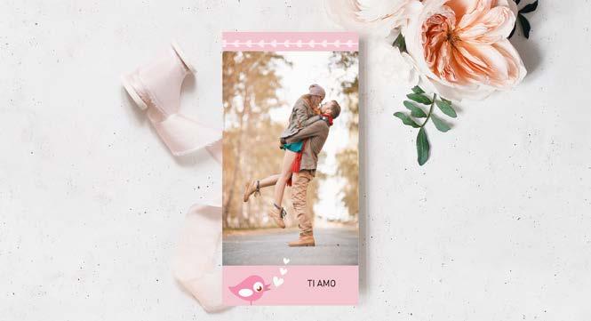 sul fronte con foto, testi e sfondi e sul retro uno sfondo a scelta fra tante fantasie grafiche.