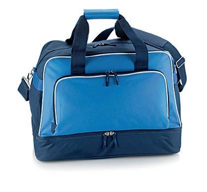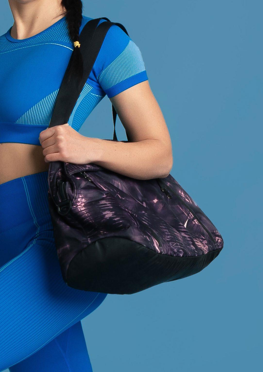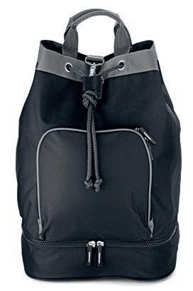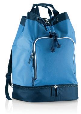 Sacca/zaino sport con comparto principale con chiusura a strozzo e moschettone in metallo, accesso sul retro con zip, spallacci imbottiti e regolabili, maniglie imbottite e tasca frontale con zip. Doppio fondo con fori di aerazione e zip a denti plastici. Tira zip in tessuto con impunture in contrasto. Vaschetta rigida non inclusa.