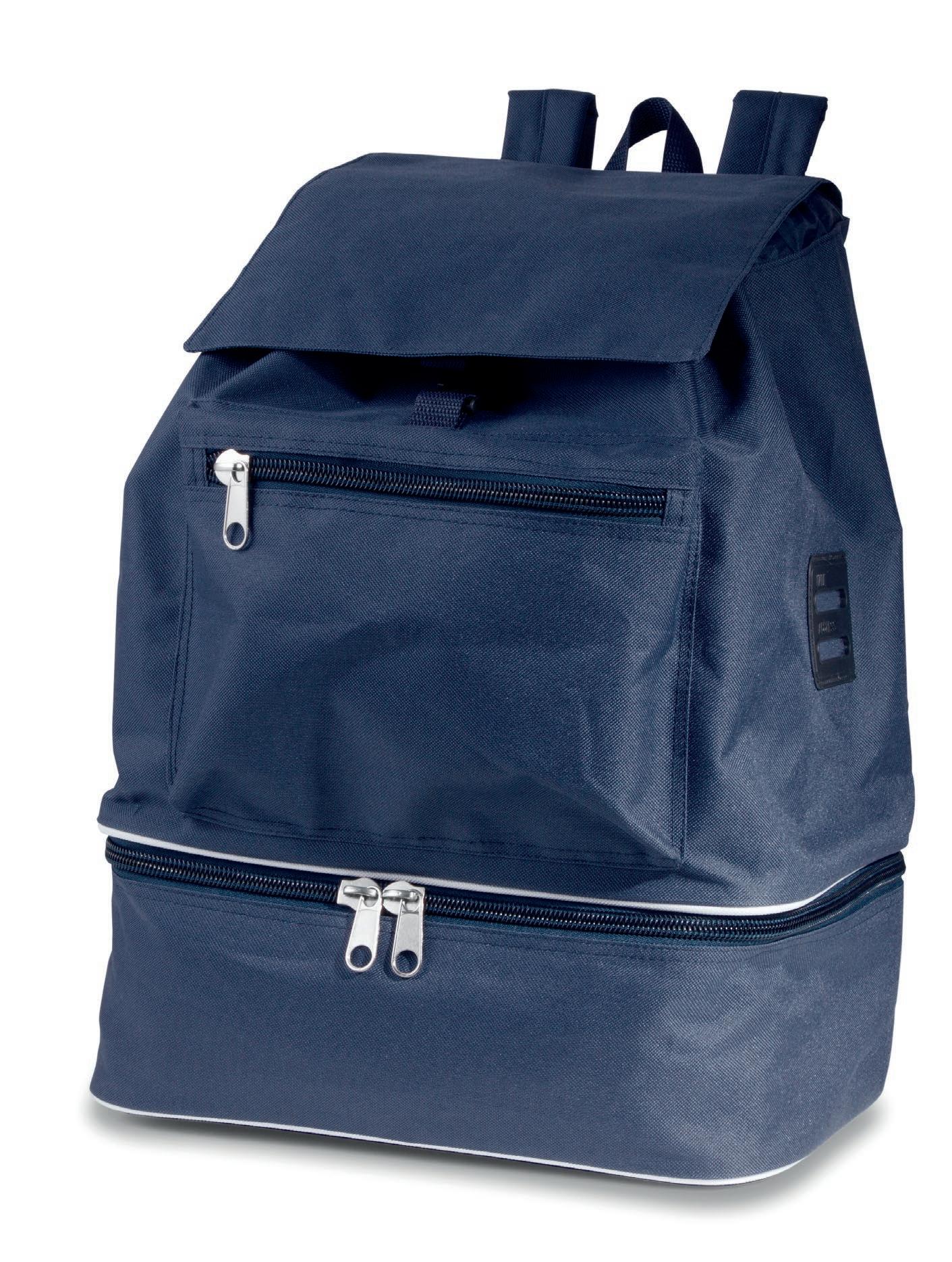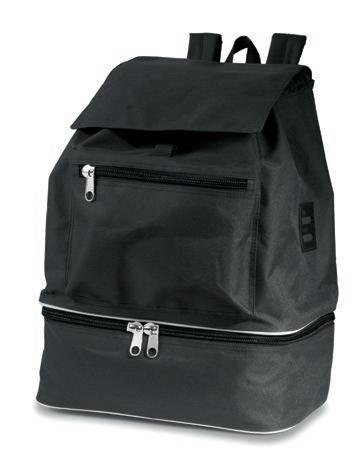 Zaino sport con ampio comparto principale con chiusura a strozzo, tasca frontale con zip, doppio fondo per le scarpe, spallacci imbottiti, maniglia per il trasporto, tira zip in metallo. Vaschetta rigida non inclusa, disponibile a richiesta.