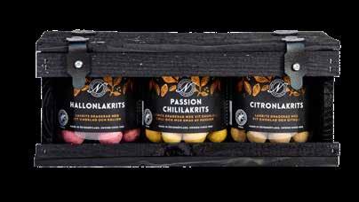 Tre chokladburkar med underbara smaker (citronlakrits, passion/chili, hallonlakrits) en svart handsnickrad ask. Perfekt gå bort present eller tack för hjälpen gåva. Vi vet att den även uppskattas som en fin sommargåva.