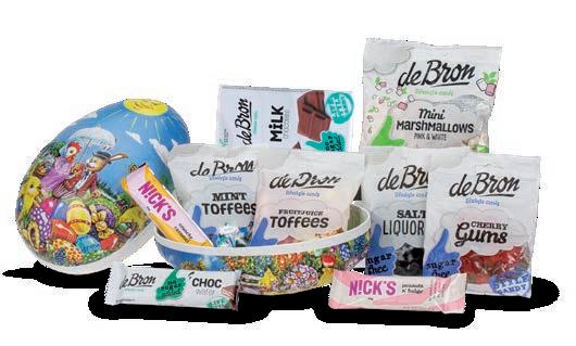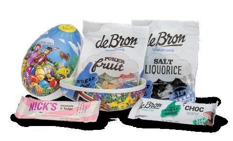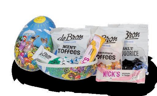 : De Bron Choc Wafer 34g, Nicks Peanuts n' fudge 40g, De Bron Salt liquorice 100g, Nicks Crunchi Caramel 28g, De Bron mint toffees 90g, De Bron Milk Chocolate 85g, De Bron Mini Marshmallows 75g, De Bron Cherry Gums 90g, De Bron Fruitjuice Toffees 90g.