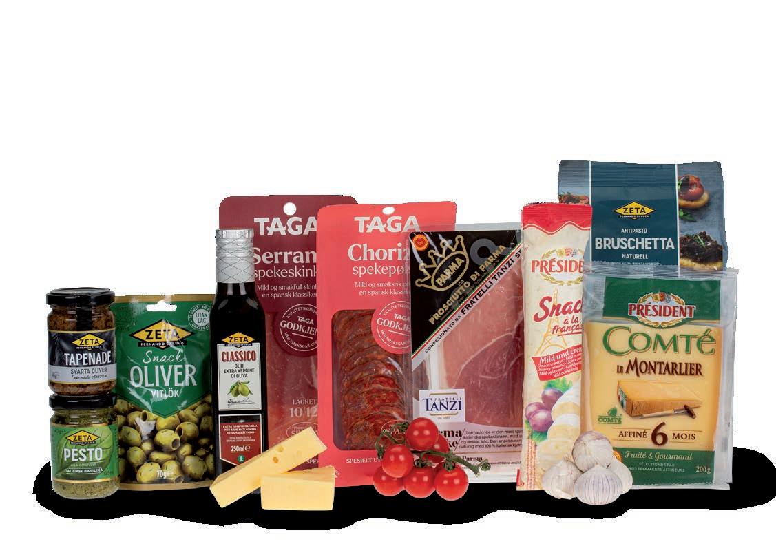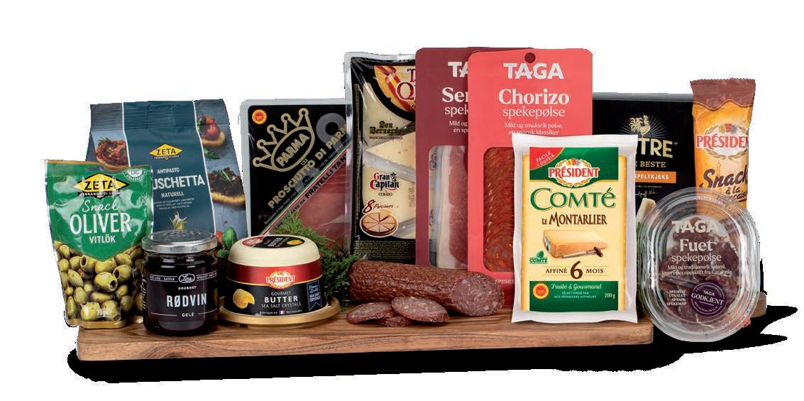 Innhold: Rødvinspølse 200g, Ringstad Fenalår 100g, Norsk spekeskinke 75g, Serrano Skivet Jamandor 70g, Akevittgele Gourmet Lisa 280g, Potetflatbrød 210g.