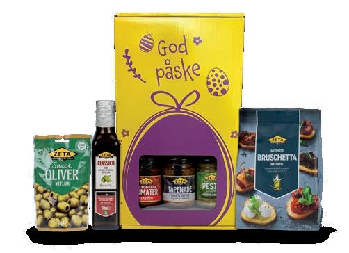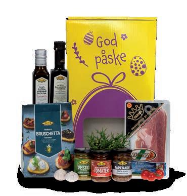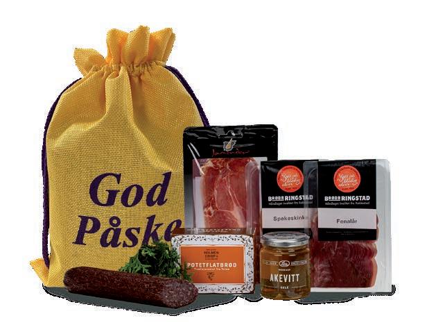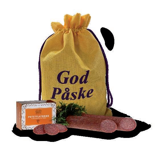 Innhold: Rumpetaske, Asina appelsinbrus 0,5 L, Cocio 250ml, Taga Fuet spekepølse 175g, Rødvin pølsesnabb 230g, Kims Salt Crunch 30g, Påskeegg 12 cm Norske klassikere 160g.