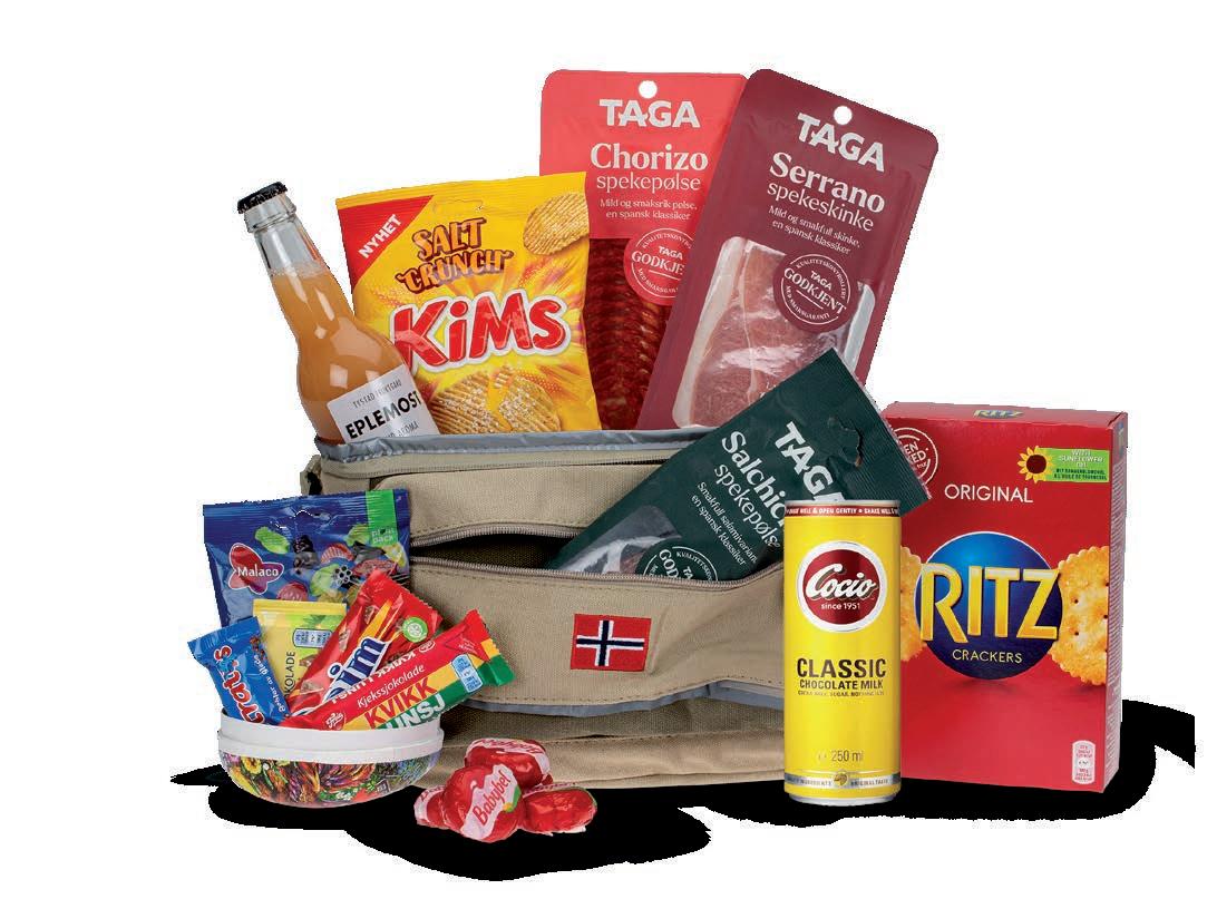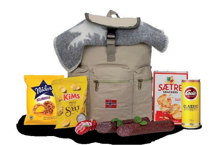 Innhold: Olasekk med norsk flagg, Sitteunderlag, Rødvinspølse snabb 220 g, President Snacking Brie 180g, Kolibriegg pose 168g, Sætre salt kjeks, Kims Salt Crunch 30g, Cocio 250ml.