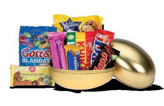 Innhold: Smågodt 500g, IPB Classic 300g, Nidar Påske Marsipan 138g, Kolibriegg pose 168g, Anthon Berg Mandelegg 80g, Kvikk Lunsj 47g.