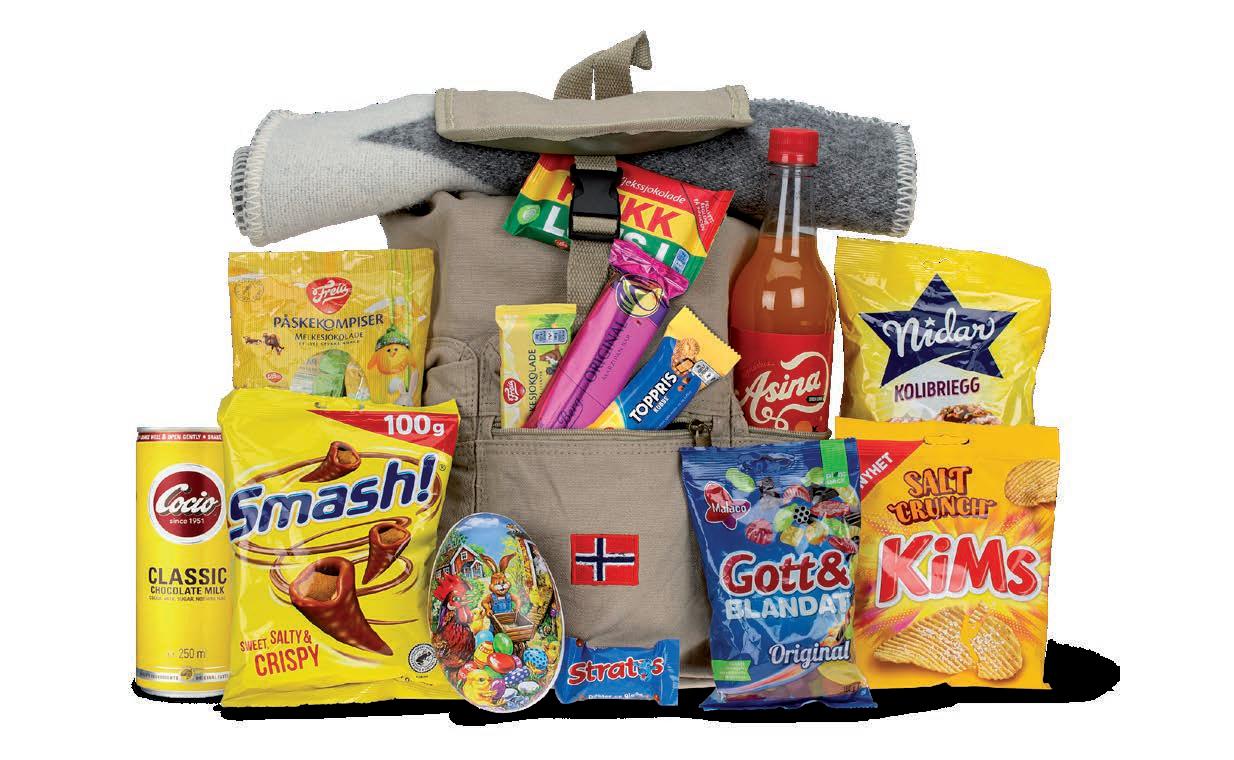 Innhold: Bilar 125g, Squashies drumstick 60g, 3-pack Kvikk Lunsj 141g, Kvikk Lunsj biter 130g, Gott & Blandat 160g, Smash 100g, Nidar påskemarsipan 138 g, Melkesjokolade 100g, Mentos Fanta 37,5g, Marsipanpølser 5 stk 110g, Påskeskum 100g, Pipers Cheddar & onion 40g.