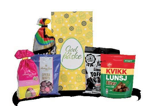 Innhold: Walkers Liqourice 119g, Nidar Påske Marsipan 138g, Smash 100g, Påskeskum 100g, Påskekompiser 120g, Kvikk Lunsj 47g, Kvikk Lunsj biter 130g.