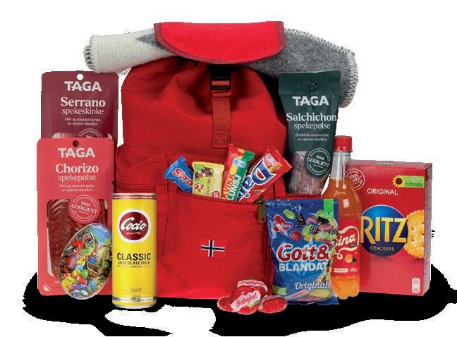 Innhold: Olasekk med norsk flagg rød, Sitteunderlag, Asina Appelsin brus, Cocio 250ml, Serranoskinke skivet 55g, Taga Chorizo spekepølse 70g, Ritz kjeks 200g, Taga Salchicon spekepølse , Baby Bell Mini Ost 120g, Påskeegg 12 cm Norske klassikere 160g.