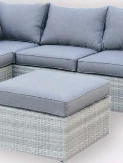 Sofabord L: 120 x D: 60 x H: 45 cm. Siddehøjde 40 cm. Sofa og stolene har klapbord-funktion i den højre side. Pulverlakeret hvidt aluminium +10 cm hynder.