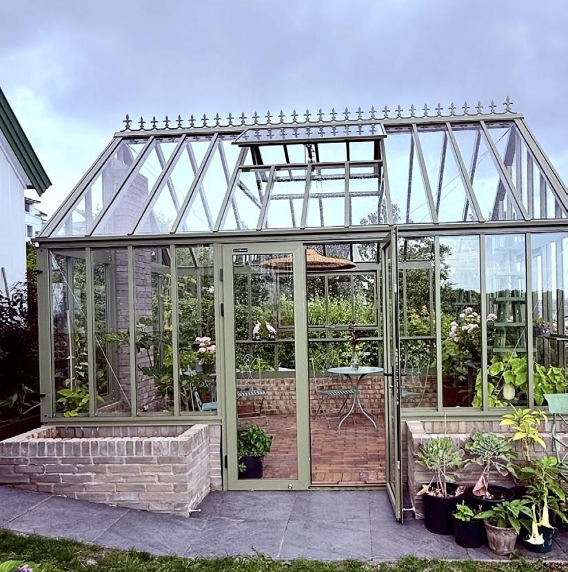 Drivhuset er et Green Room Botanic Elegant Wall på 14,5 kvadratmeter fra Willab Garden, i en dempet khakigrønn farge som glir naturlig inn i hagen.