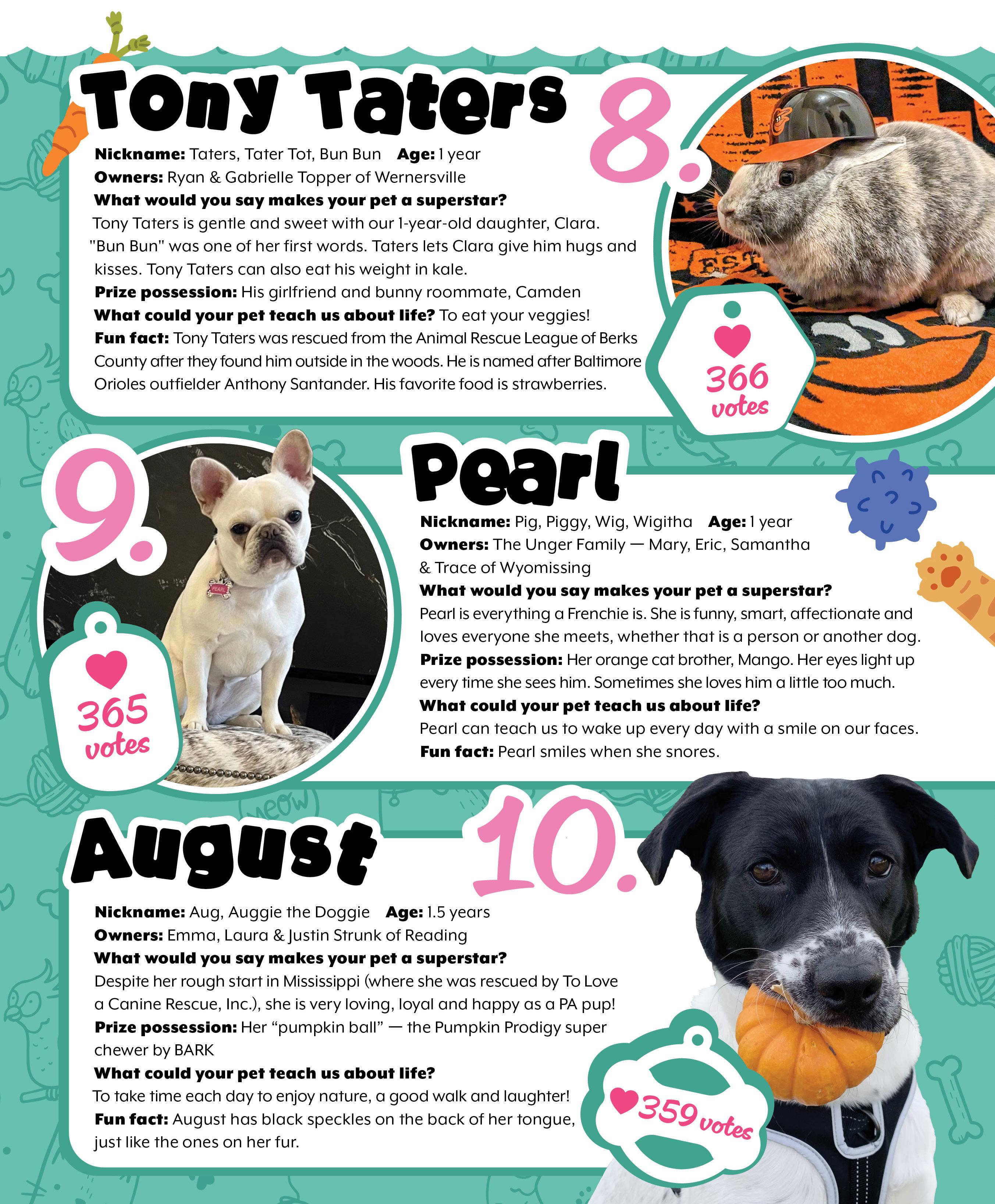 That’s right. This installment marks the reveal of the Top 10 winners in our 11th Annual Pet Photo Contest. And the competition was fierce. But, for the most part, the dogs reigned supreme with one surprise interrupter, that is. Get to know those that garnered the most votes starting on page 23.
