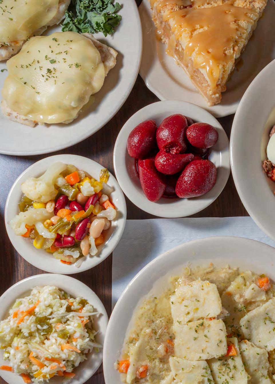 plus a pile of potato filling (for the uninitiated, this specialty is “like” mashed potatoes, only oodles more exciting and flavorful with its secret ingredients). Created with 100 percent ground beef, thick meatloaf slices are covered with rich beef gravy (or, if you prefer, marinara for a tomato touch). Beyond that, the kitchen serves up a surprise with Meatloaf Parmigiana, where — as one customer puts it — “Pennsylvania Dutch meets Italy” on a platter featuring melted provolone cheese and marinara sauce, a thoroughly satisfying doublecomfort food.