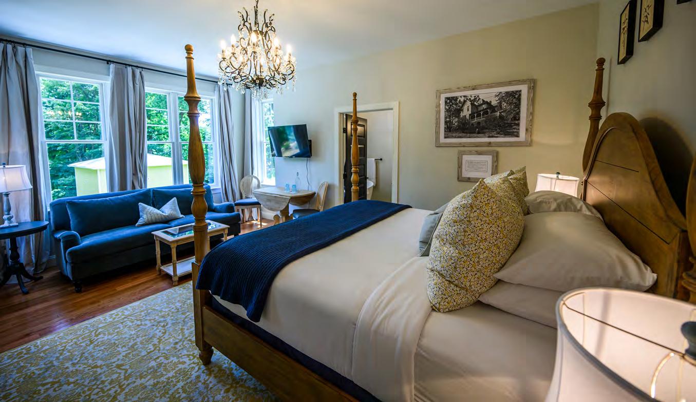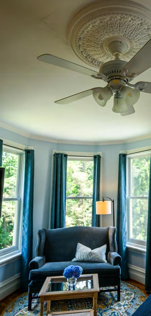 The first-floor Walnut Room, ADA accessible, has an attached private porch, two powder rooms and the same architecturally faithful décor as the other guest rooms, such as the Highland (a double-queen-bed room that can