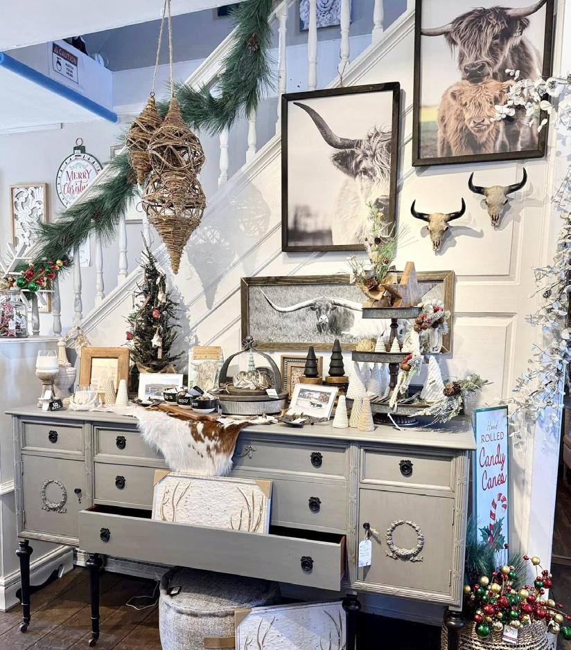 When you’re incorporating these pieces into your home’s existing décor, Kane has plenty of helpful suggestions. She creates eye-catching displays at Theresa’s Farmhouse Finds to help inspire her customers. “I just love taking the old and mixing it with the new to make a whole new look,” she enthuses. “You can use an old vase or a pitcher, add some fresh flowers or faux flowers and bring that piece back to life Place it on an old stack of books and voila! You have a pretty vignette.”