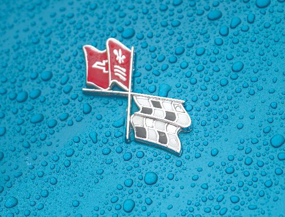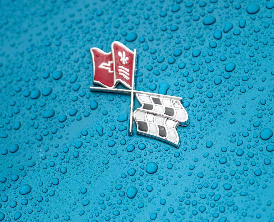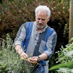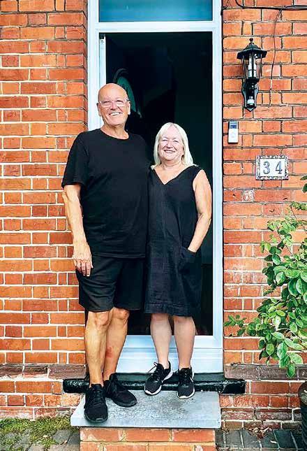 Liz’s gardening skills are evident in blue and terracotta containers overflowing with red and salmon geraniums,