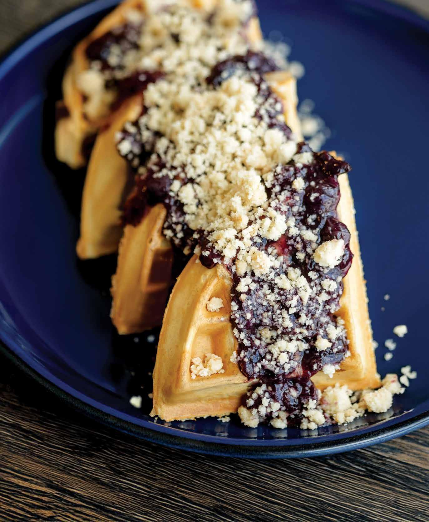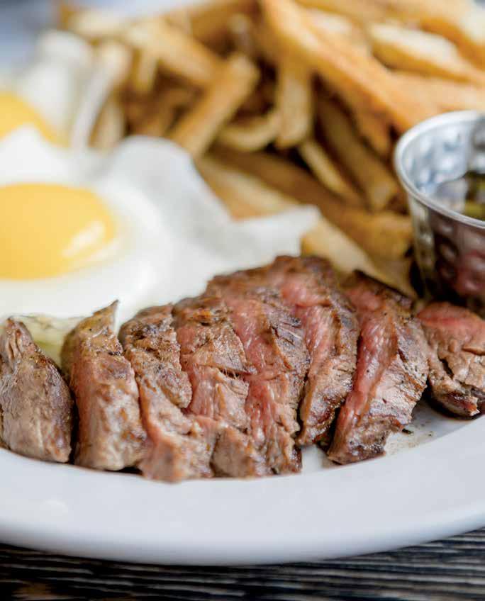 If you come in rip-roaringly hungry, seeking a heavy hit of protein and potatoes, aim at Steak Frites & Eggs. This dish features skirt steak with a side of house-made chimichurri, fries, two eggs how you like ’em and choice of toast from wheat to rye to sourdough. Mike is very focused on one goal: “I want to give you quality. I give good food — period!” He comes through on that promise, choosing all the finest ingredients, from using black Angus beef, preparing eggs with sunny yolks and bright whites that look like they’re right from the hen, to making his own culinary version of delicious french fries. “We make only freshcut fries,” he says. “We don’t do frozen fries. Our fries are lightly seasoned — just a little sea salt and oregano.” For this particular meal, he crafts a