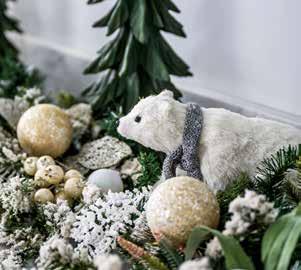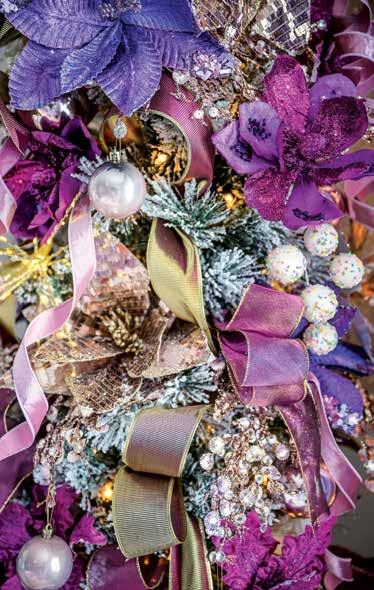She displays several trees — all proudly artificial and sourced from Puleo International. Not only are they more versatile in size and variety and ultimate affordability, but she wryly notes, they don’t bring inside some of the intriguing but problematic flora and fauna elements that can attach themselves to the harvested evergreens.