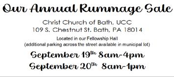 Chicken BBQ September 13, 4 to 7 pm at St. John’s UCC, Laurys Station. (1 mile west off Route 145 on Rising Sun Road) First 300 served, eat in or take out. Call church office for tickets, 610-262-8061. Adult $12 (1/2 chicken, baked potato, corn on cob, lettuce w/bacon dressing, beverage and dessert), kids $6 (2 drum sticks, Mac N Cheese, applesauce , cookie and beverage). ((9/4)