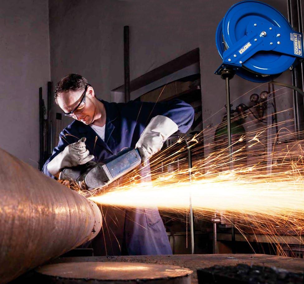 Enhance workplace productivity and eliminate trip hazards with the Upright 3 Hose Reel Assembly (TH7-8). This heavy-duty unit keeps hoses neatly stored and off the floor, creating a cleaner, safer, and more efficient environment. Other hose storage solutions available. Distributor opportunities available— contact Jeff Lewis at jlewis@ safetystep.net or 540-362-9636 Learn more at www.hosefabworkstations.com
