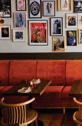 Undoubtedly, however, the showstopper is the 30foot, mid-century-meets-70s banquette, custom-upholstered in 20 yards of orange velvet. Fun and funky, it plays well with the gallery above it, which includes prints and sketches—some cheeky and irreverent—along with photographs of Romero’s family.