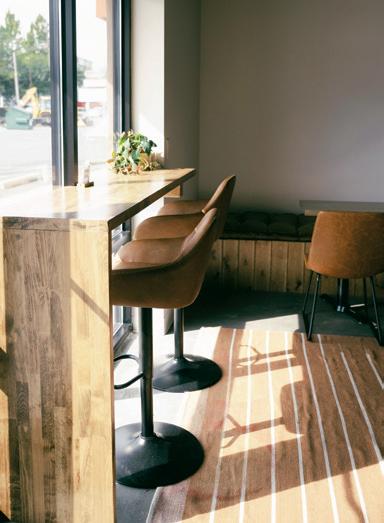 The pop-up shop inspired conversations about the permanent shop, which opened on June 6. Goulet decorated the space with vintage Facebook Marketplace finds, like the Lancaster general store shelves display ing T-shirts. A country-store screen door, showing wear from decades of hands grabbing the handle, serves as a divider. The counter from a Richmond, Virginia, piz zeria, rustic in reclaimed wood and corrugated metal, offers a spot for chatting.