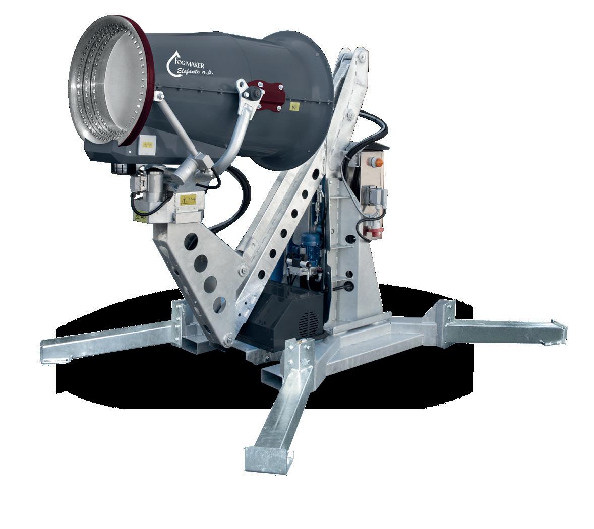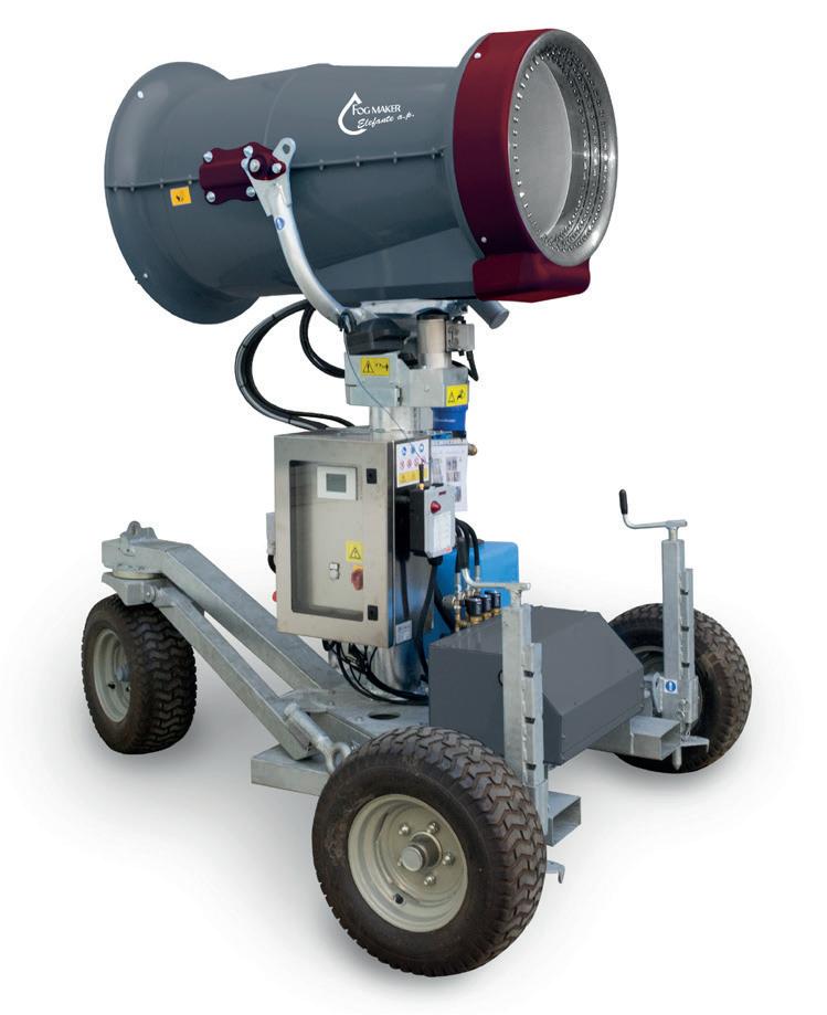 Mobile high pressure fog maker complete with fan and ring of nozzles, 60bar 1 and 4 l/min pump module, 30L tank (Lince 1), ON-OFF electric panel. Fan jet: 7m.