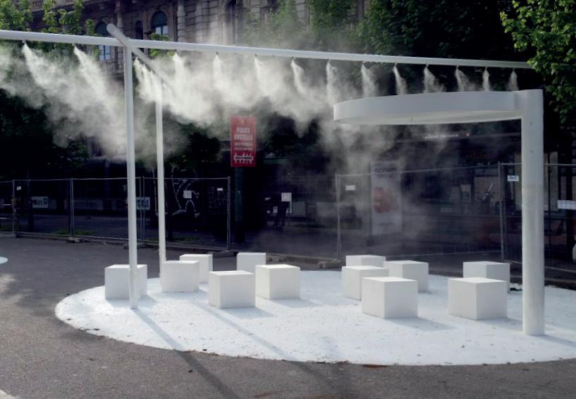 Accessoire de rafraîchissement à structure en acier inox AISI 304 prépercée équipée de 8 buses de nébulisation avec trou 0,15mm et antigouttes. Raccordement enterré et fixation au sol de la structure prévus.