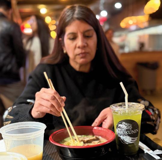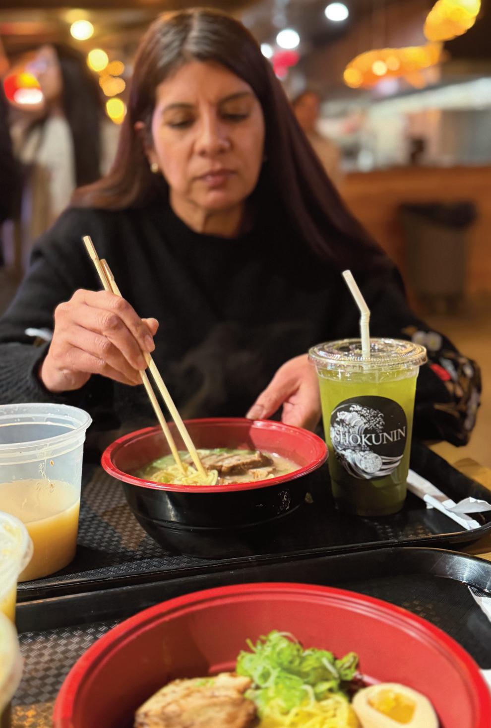 IECN co-publisher Denise Berver samples the matcha tonkatsu ramen.
