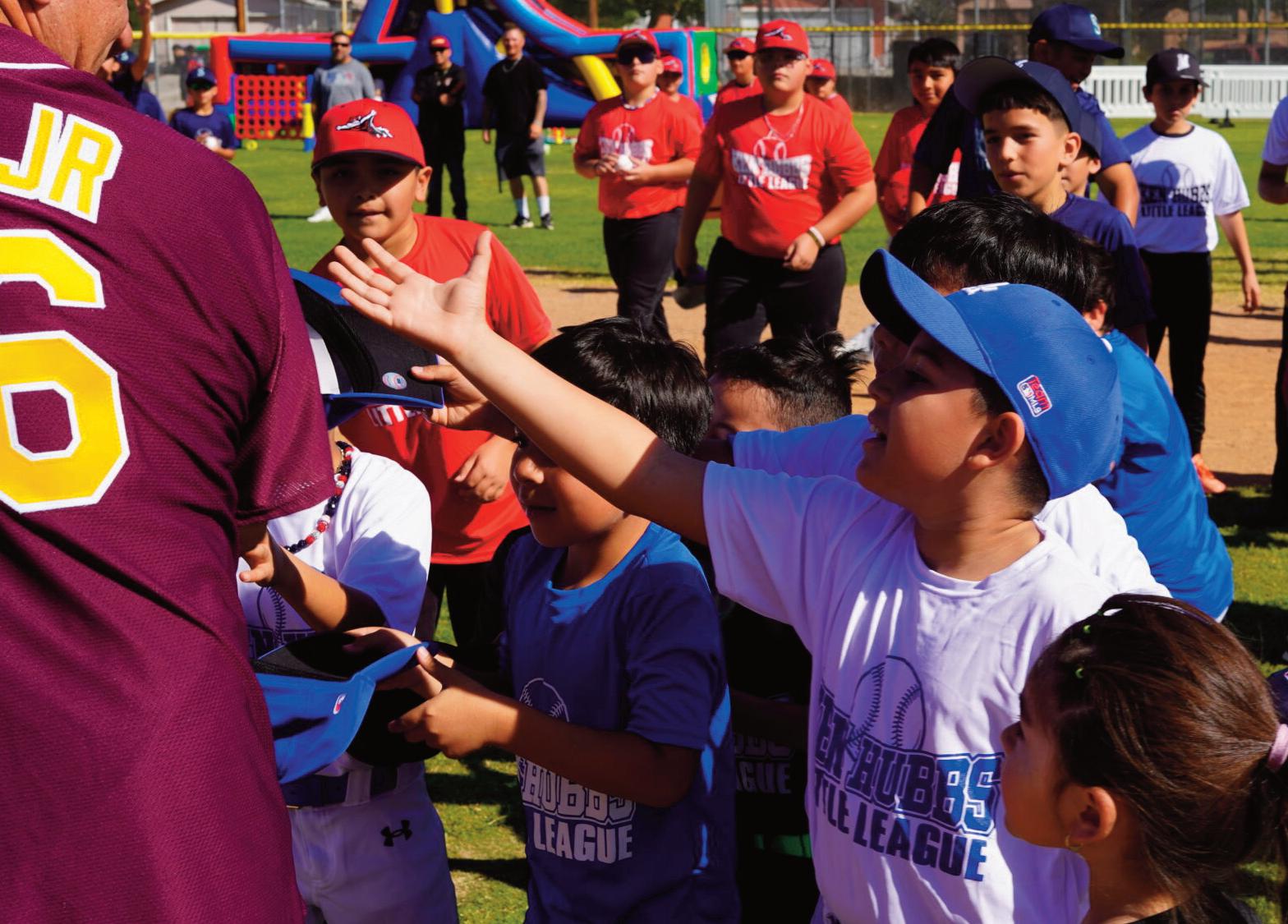 San Bernardino County Supervisor Joe Baca Jr. hands out baseballs and softballs to young players, drawing a crowd of eager athletes during Ken Hubbs Memorial Little League’s opening day in Colton.