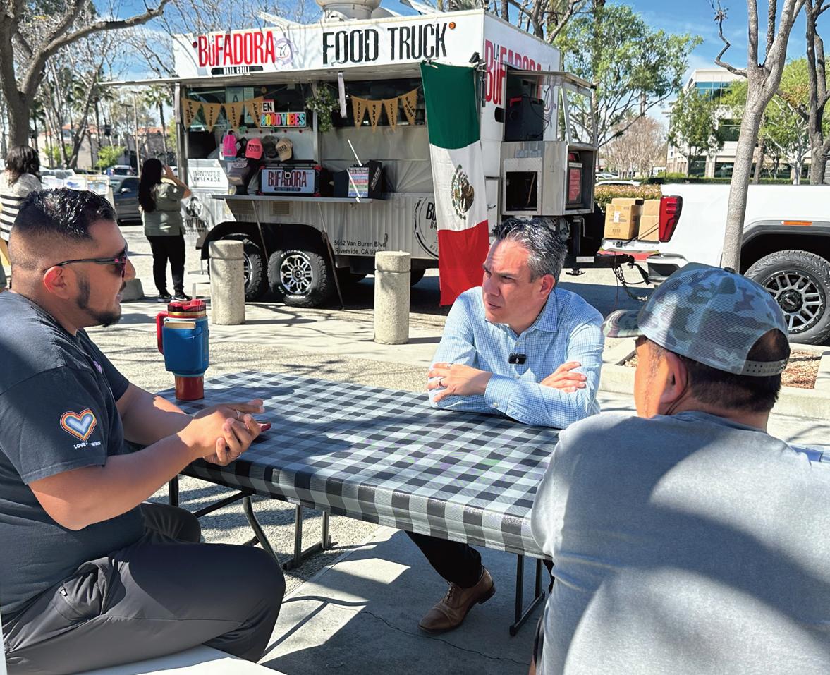 Rep. Pete Aguilar meets with La Bufadora Baja Grill owners outside their food truck to discuss rising fuel and operating costs impacting Inland Empire food vendors.