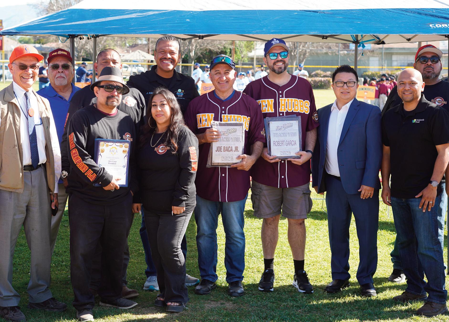 San Bernardino County Supervisor Joe Baca Jr. presents certificates of recognition to Ken Hubbs Memorial Little League President Alex Gago and other league officials during the league’s 75th anniversary opening ceremonies in Colton.
