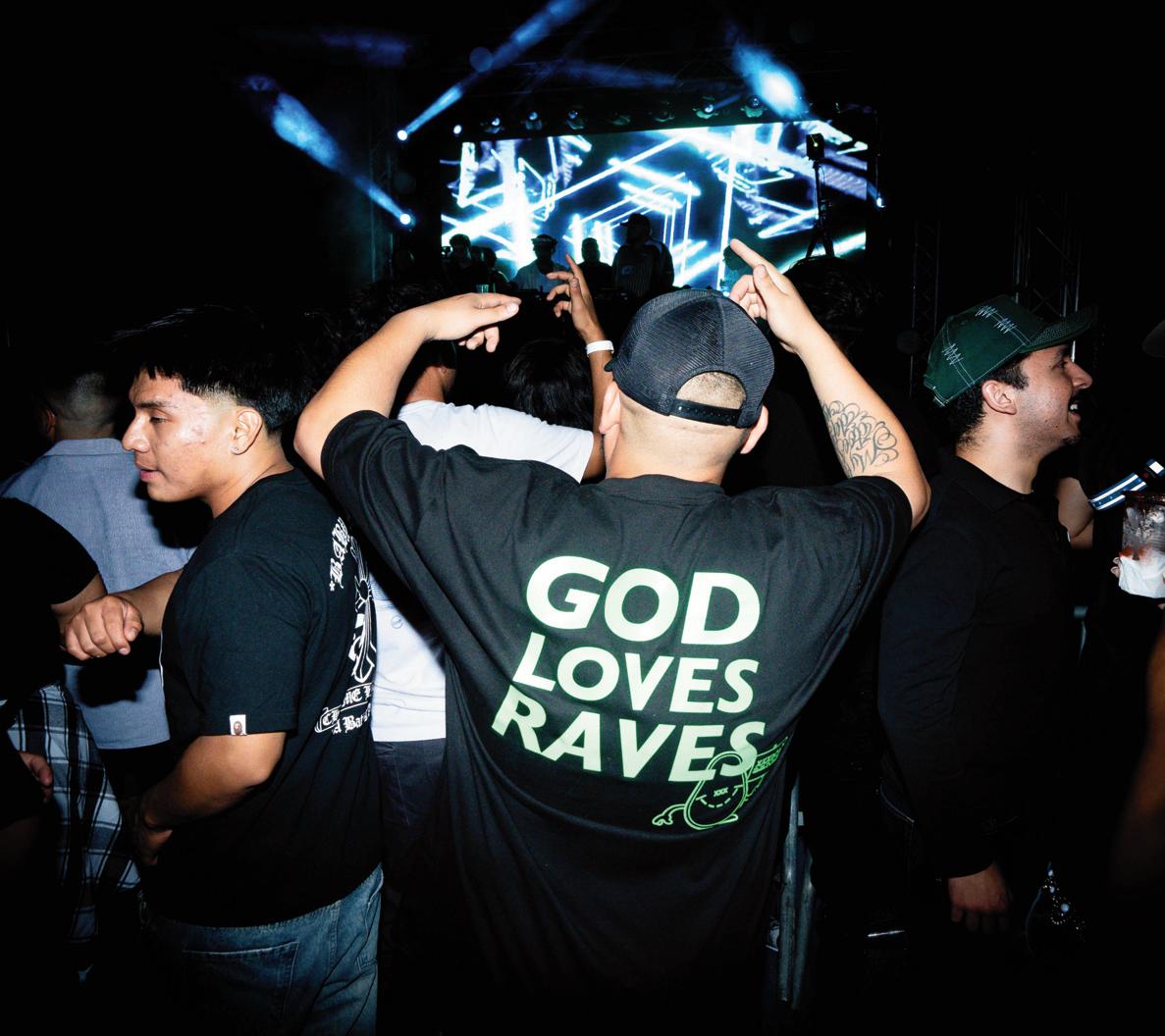 An attendee at a rave sports XXX DCD’s “God Loves Raves” shirt near the stage during a nighttime performance.