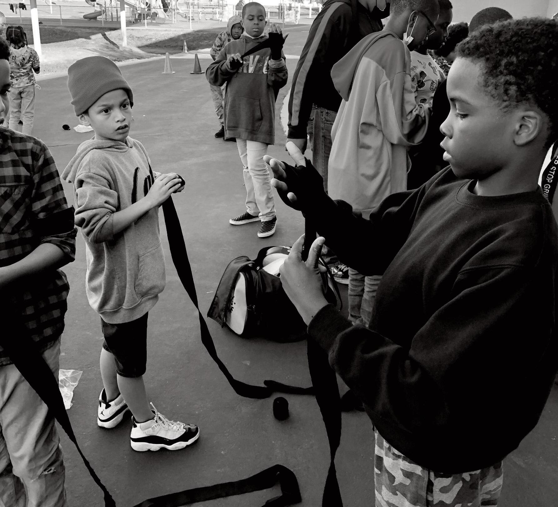 NSG Impact CEO Darious Harris wrapping a RUSD student’s hands to prepare for a no-contact boxing lesson
