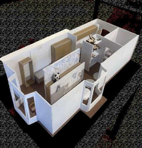 The goal of this project was to design a full-scale space for a specific profession. Initially, three boxes at a 1:20 scale were used to explore suitable volumes. In my case, the house was dedicated to a babysitter. After thorough research and brainstorming, I decided to base the concept on "Mobility," emphasizing the multifunctionality of the space. The design centers around the use of transforming furniture, allowing the living area to easily adapt from a personal space to a functional workspace—in this case, an area for childcare and children's entertainment.