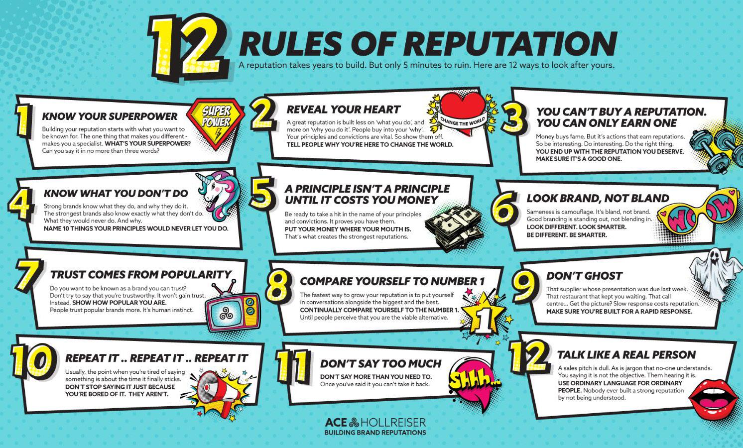 A t ACE Hollreiser we wanted to make the fundamentals of reputation management easy for our clients to digest so created our twelve rules of reputation.