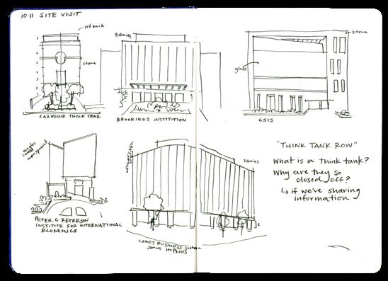 This project is comprised of a system of layers which defne the experience of a think tank on Dupont Circle. On the exterior, these layers defne the facade, mediating interaction between the street and the interior. On the interior, the layers are scaled into bigger moves defned by programmatic needs.