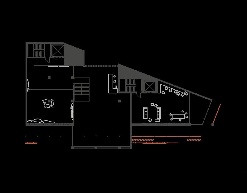 Also based on the structural grid are three interior volumes, dividing the site into programmatic zones. On the left, the most solid, opaque volume houses gallery and making spaces, along with associated offces and utility space. On the right, closest to Dupont Circle, a translucent volume houses space for meeting and discussion and provides views out to the park. These two zones meet in a fully transparent central atrium which pushes out into the sidewalk, drawing visitors through the layers and to the interior.