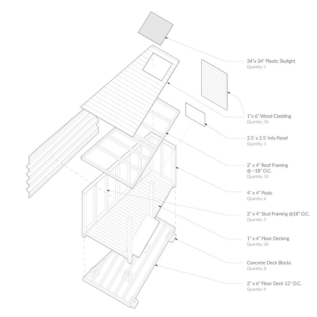 These themes are explored through program, views, materiality, and landscape. Four main programmatic elements make up the design. Workshops for making and meeting, a cafe, and an amphitheater each work to provide a starting point from which to experience the site in different ways. These spaces are gathered towards the center of a canopy uniting the space, and arranged around a central courtyard of native plantings. This arrangement frees up the edge of the building to allow the site to creep back in and encourage movement out into the world. From this courtyard, views are provided out into the site towards hiking trails, canals, and the pump house.