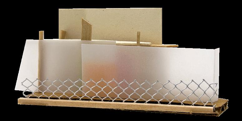 The primary layer is the structural grid, followed by a screen layer spanning the entire facade. The next layer flters light, and the next blurs the layers and volumes beyond. Lastly, the thinnest and most fexible layer provides space for display.