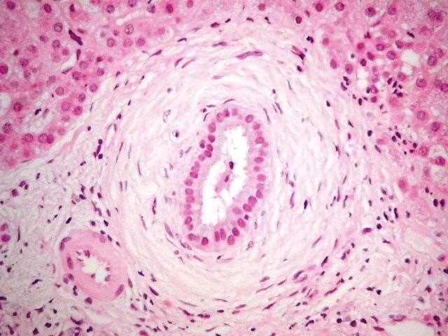 • C Ductular proliferation and bile accumulation