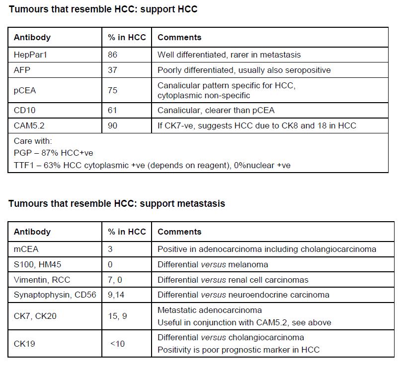 • ID and classification of tumours: HepPar1, AFP, p and mCEA, Glypican-3, Glutamine synthetase, MOC-31, CKs, CD68, SAA