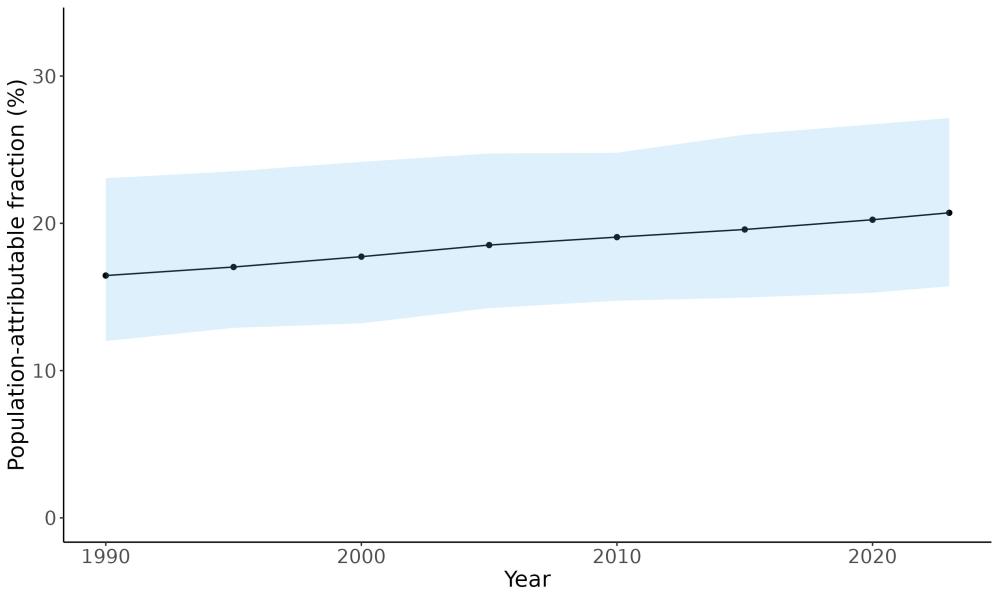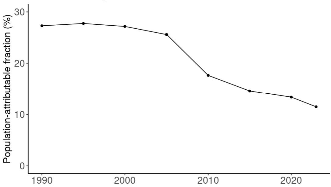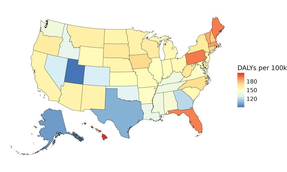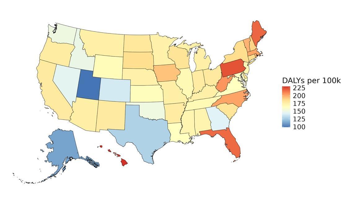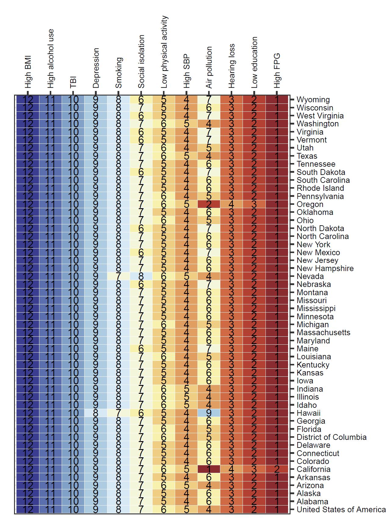 At the Institute for Health Metrics and Evaluation, we produce the world’s most granular estimates of health loss due to dementia by US state, by sex and age, and over time as part of the ongoing Global Burden of Disease (GBD) study 1,2 We also produce estimates of exposure to disease risk factors and have developed a model to quantitatively assess the relationship between risk factors and disease and rank the strength of the evidence between disparate risk factors.3,4 In 2020, the Lancet published a Commission report on the impact of 12 modifiable risk factors on dementia.5 These risk factors include education, hearing loss, high blood pressure, diabetes, smoking, alcohol, high body mass index, low physical activity, depression, social isolation, air pollution, and traumatic brain injury. Using the risk factors identified in the Lancet Commission, we have produced US national-level and US state-specific analyses of the relative importance of each risk factor and its impact on dementia health loss.