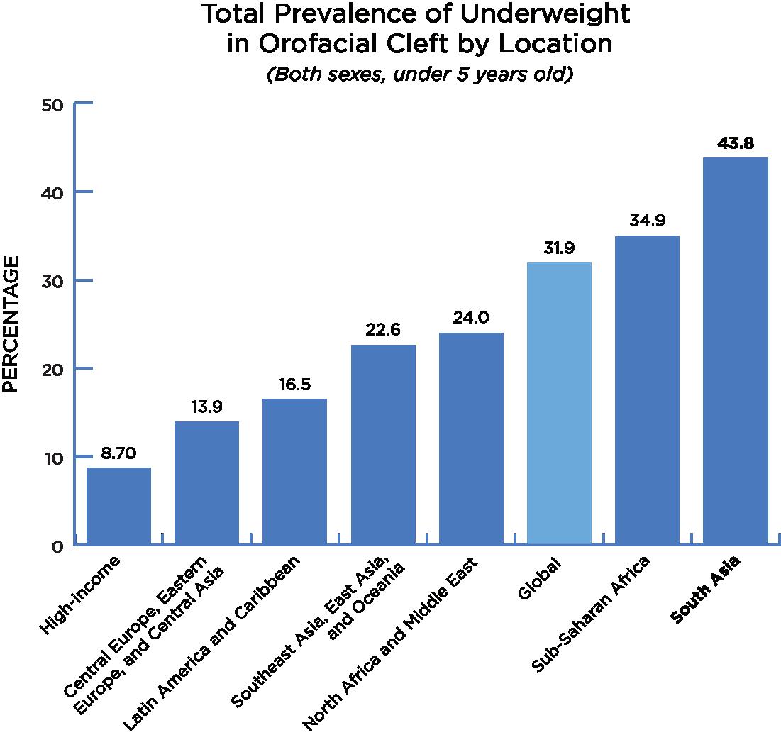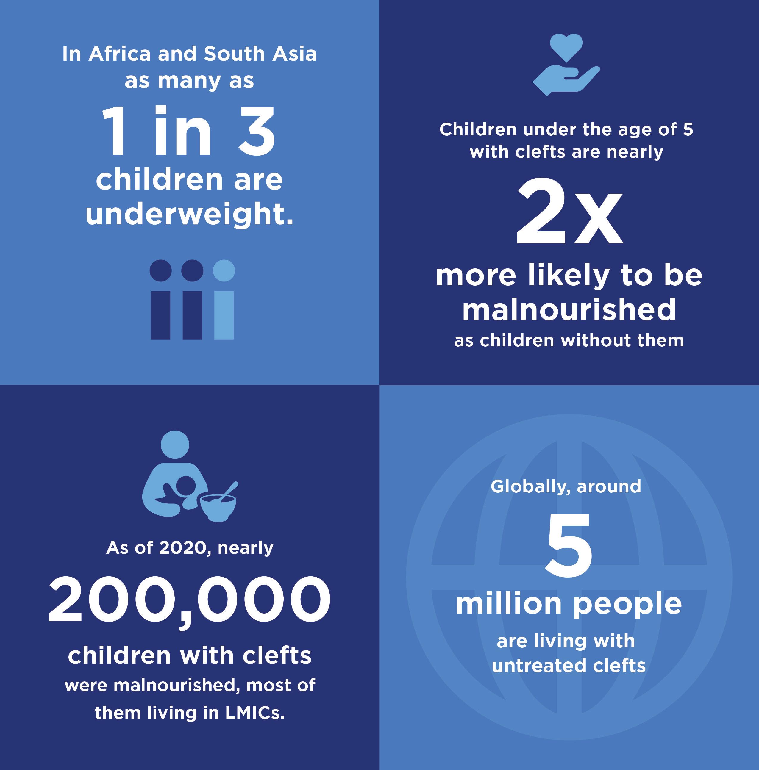 • Malnutrition is even higher for children with clefts under the age of 5, who are more than twice as likely to be malnourished as other children. As of 2020, nearly 200,000 children with clefts were malnourished, and most of them live in LMICs. In some areas, nearly half of these children are underweight.