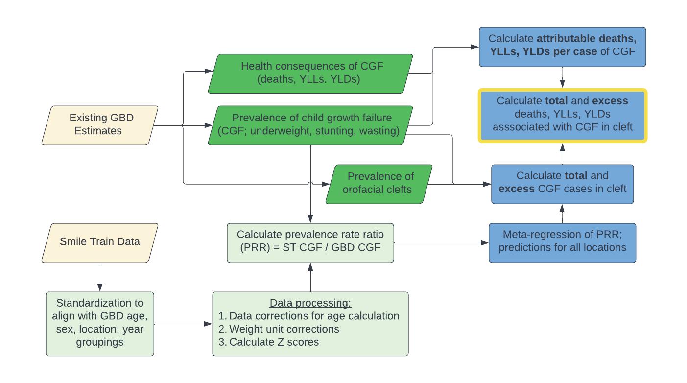 • Health consequences of malnutrition in those with clefts: We evaluated the health consequences of malnutrition in individuals with clefts by leveraging GBD-analyzed relationships between malnutrition and subsequent malnutrition-related illness and death. We applied this to the total and “excess” number of malnutrition cases in children (younger than 5 years) with clefts, allowing us to estimate the health consequences of malnutrition specifically in the cleft-affected population.