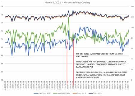 The data showed that the room in the complex furthest from the machine room was not holding temperature and that the mechanical float switch controlling the liquid feed into the surge drum for that room was always calling for liquid feed.